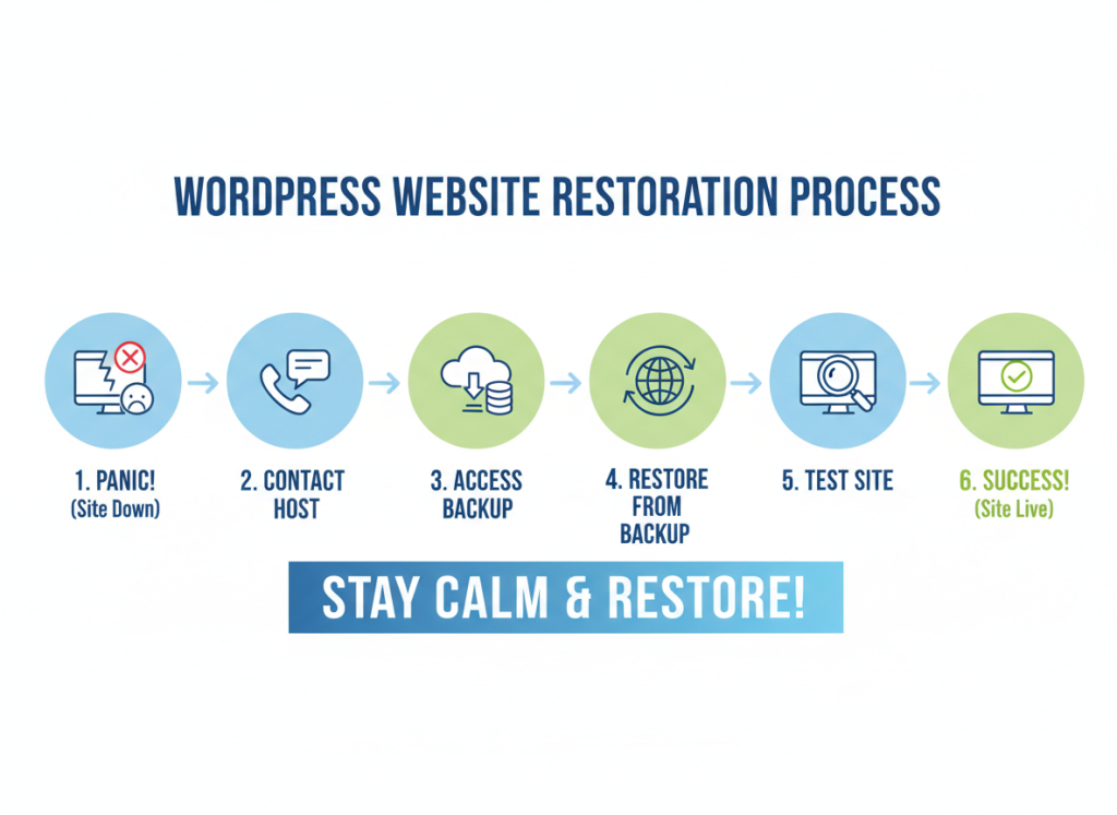 This guide is your calm, experienced WordPress friend walking you step-by-step through the fastest way to get your site back online—even if you’re panicking, even if you’re not “technical,” and even if you’re not sure you ever set up WordPress backups properly.